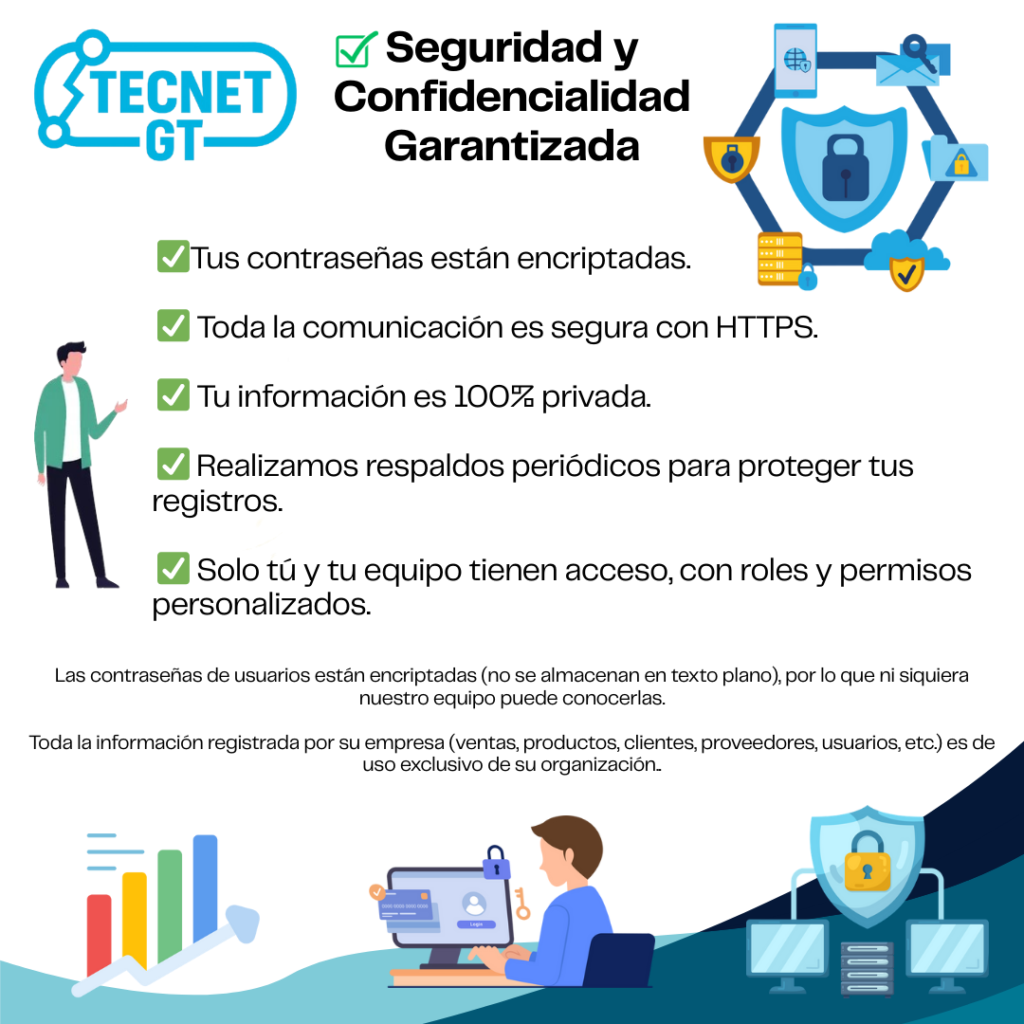 Toda la información registrada por su empresa (ventas, productos, clientes, proveedores, usuarios, etc.) es de uso exclusivo de su organización.