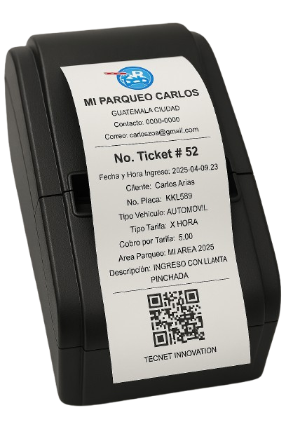 Generación de tickets con fecha y hora de ingreso, tipo de vehículo, área de parqueo, cliente y código de barras.